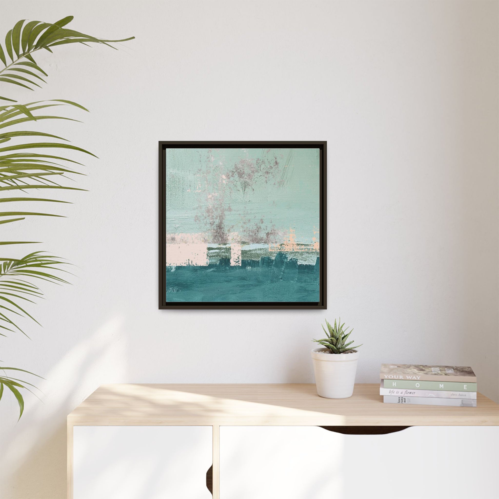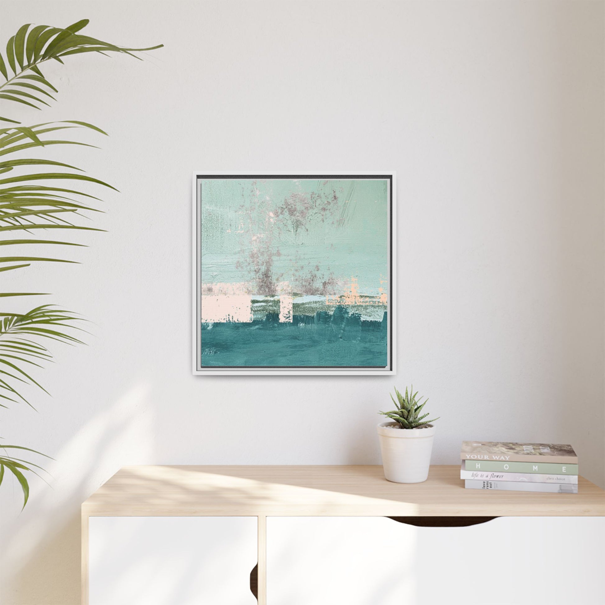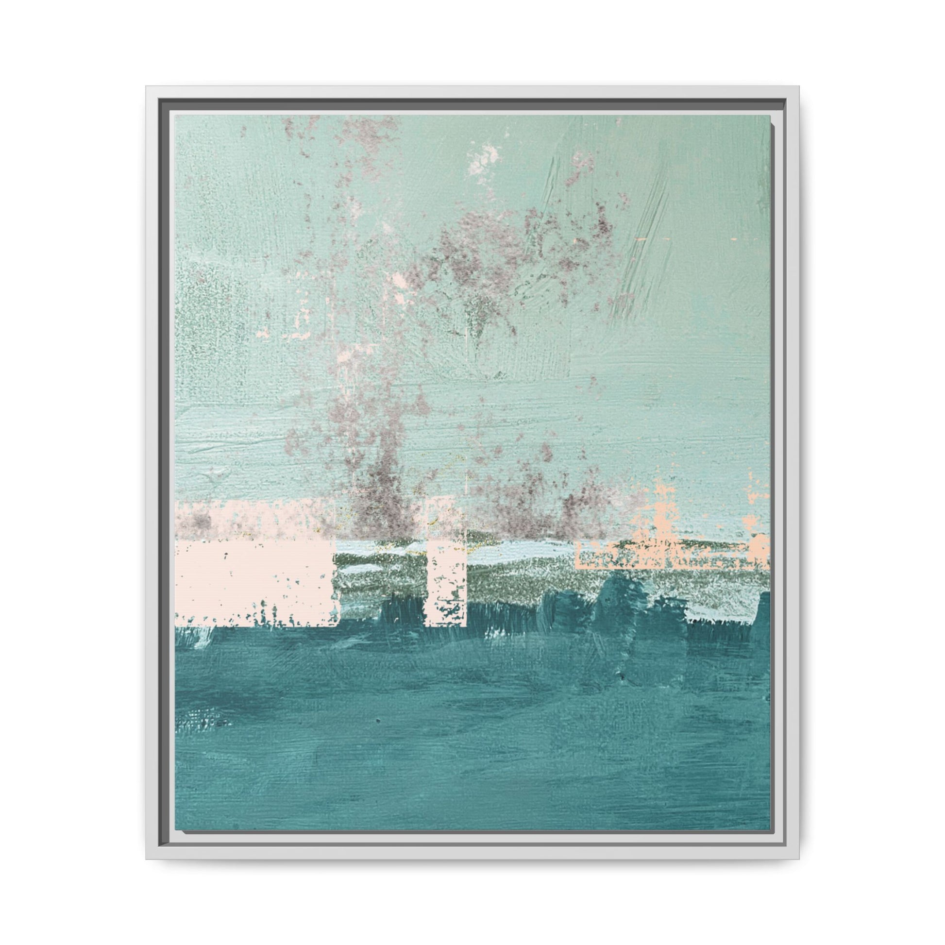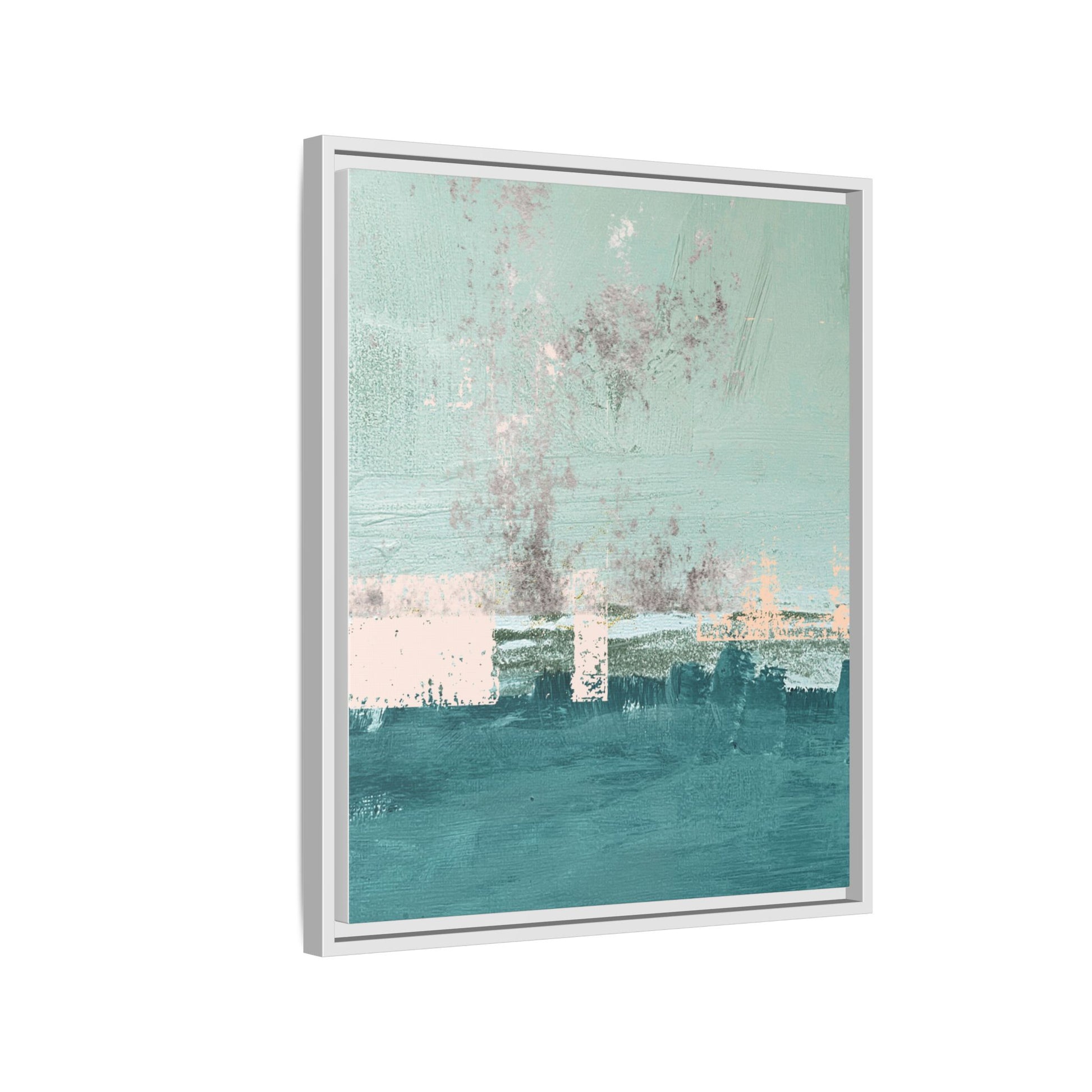 A framed matte canvas that brings an airy, coastal calm into any room. Soft aquamarine washes and textured brushstrokes recreate the hush of tide and weathered shoreline — colors that feel both modern and quietly lived-in. The slim pine frame gives the piece a grounded, gallery-ready presence without stealing attention from the artwork. Hang it above a bedside table, over a desk, or in a sunlit hallway to introduce a moment of gentle color and texture to everyday life.