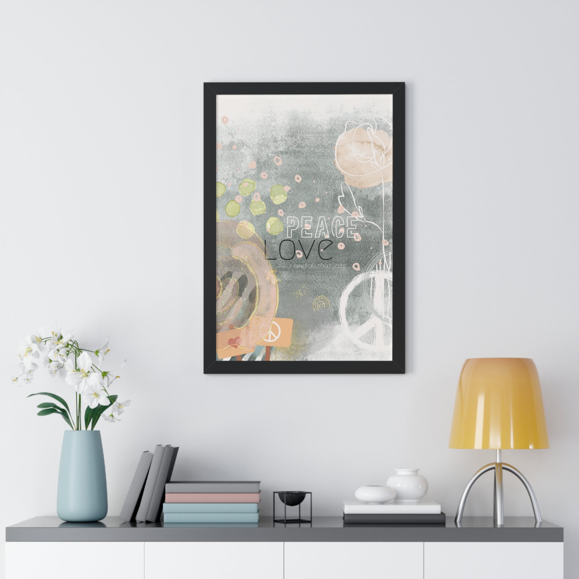 This vertical framed poster brings a soft-living, vintage-meets-bohemian mood to any wall. Subtle textured grays and muted pastels create a calm backdrop for hand-drawn peace signs and the gentle lettering ‘Peace + Love’. The museum-grade matte paper and protective acrylic cover keep the artwork looking fresh while the lightweight frame hangs flush against the wall. Choose black, white, or warm walnut finish to tune the piece to modern minimal or cozy, collected interiors. It settles easily above a console, in a reading nook, or grouped with other prints for a laid-back gallery feel.