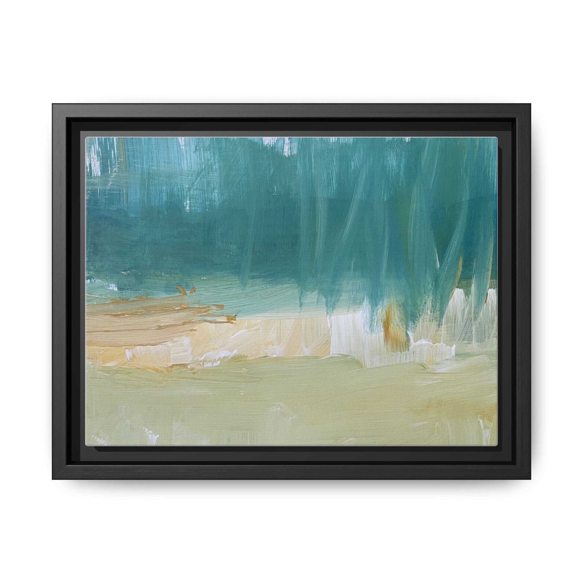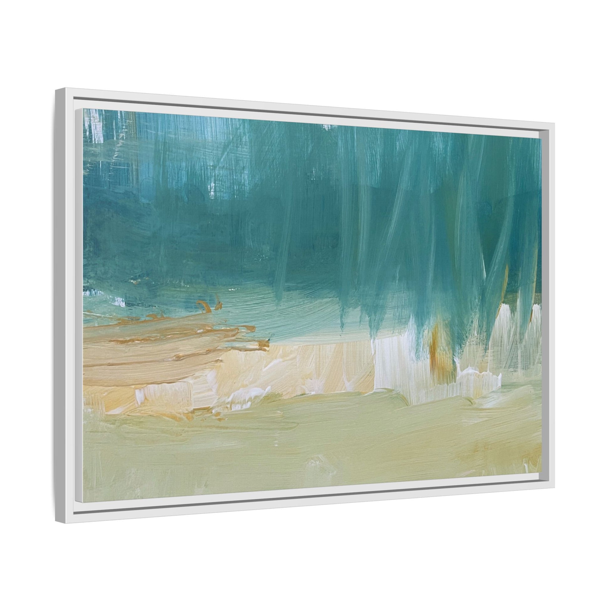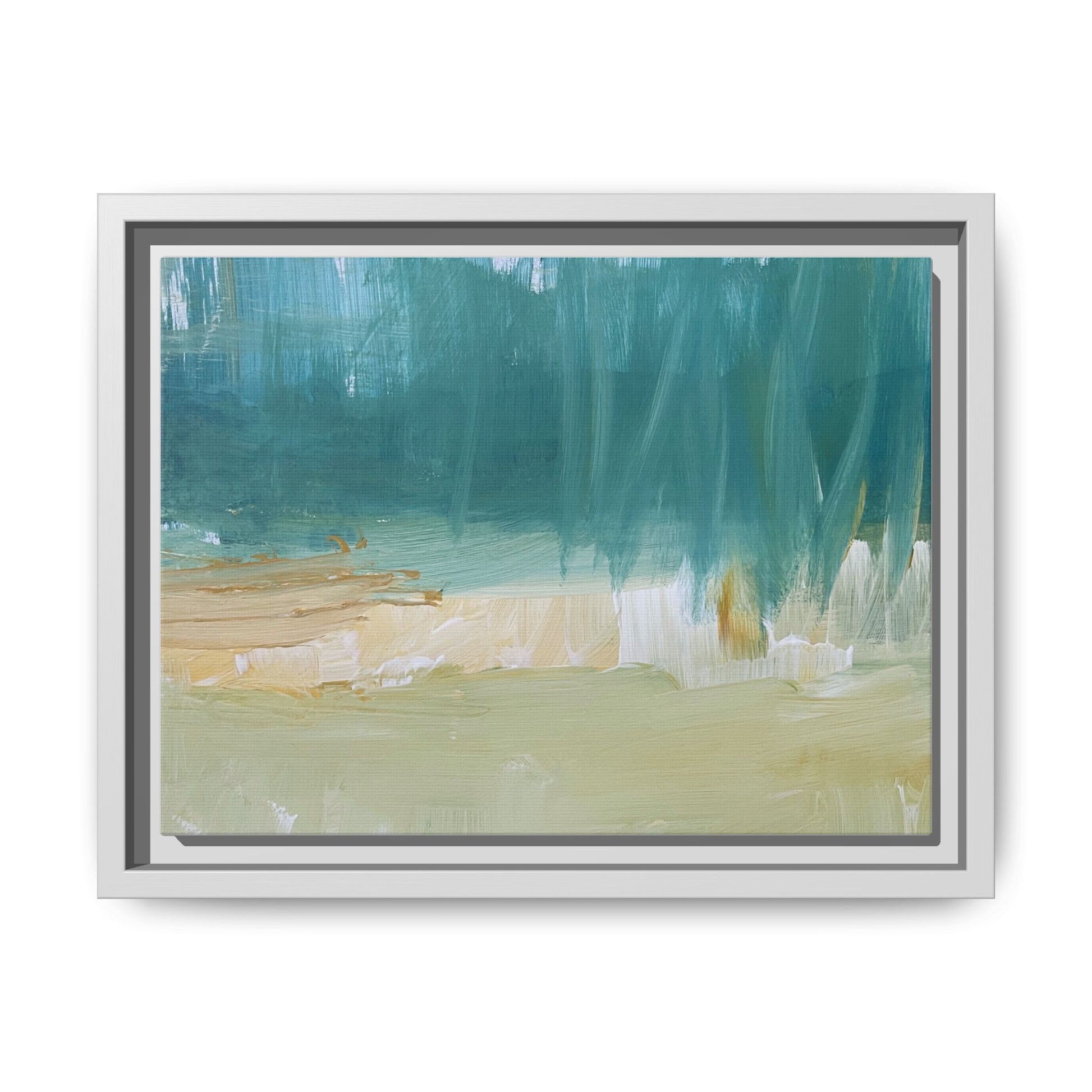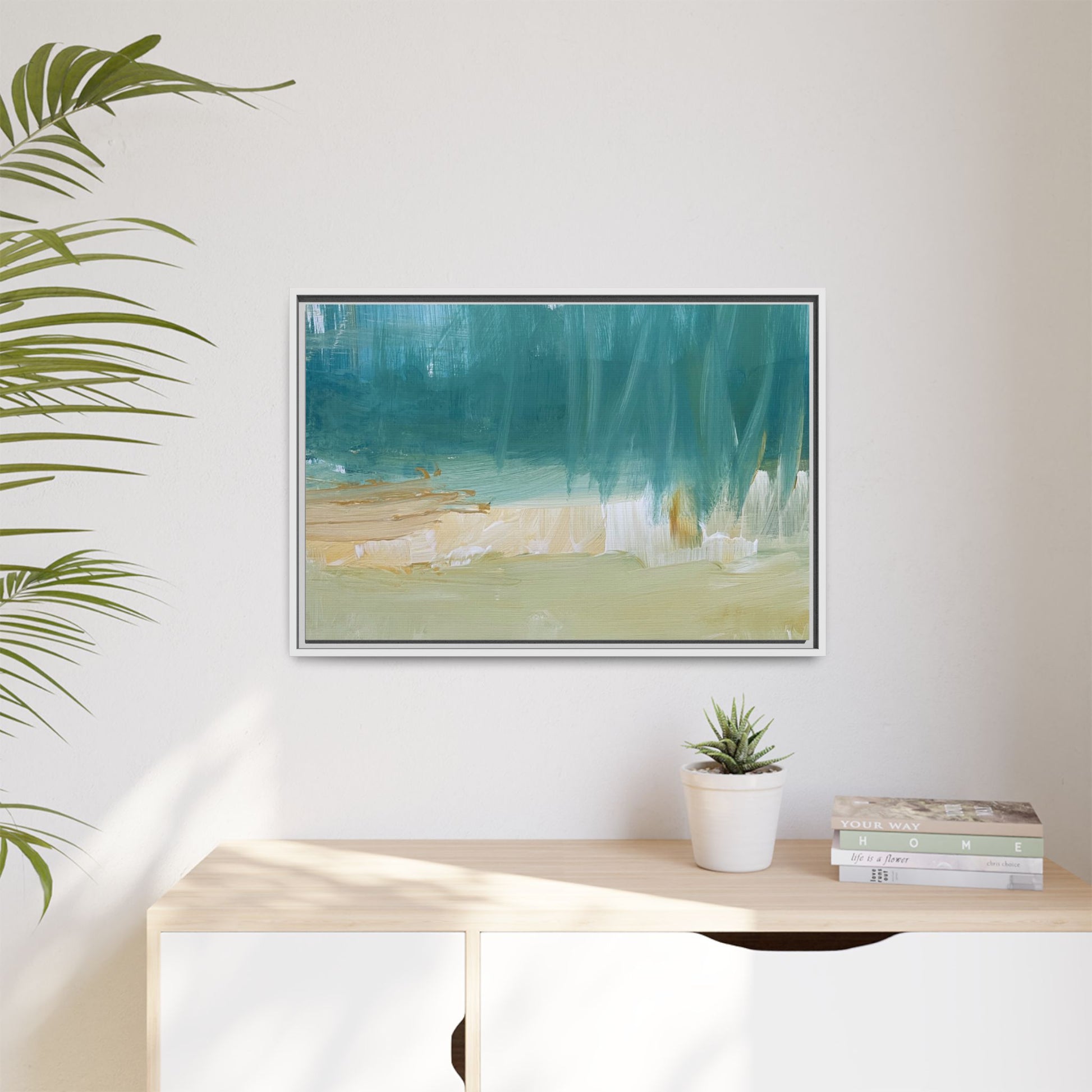 A framed matte canvas print that brings a calm, coastal mood into any room. The textured canvas and rich, layered inks capture brushstrokes and depth β oceanic teal melting into sandy neutrals β so the artwork reads like a quiet, reflective moment on the shore. The piece arrives stretched over a sustainable pine frame with a slim outer frame in your choice of colors, ready to hang with included sawtooth hardware. Itβs crafted with a durable cotton-poly canvas composite and printed with non-toxic latex inks and UL-certified Greenguard Gold inks for bright, lasting color and cleaner indoor air. Choose from multiple sizes and orientations to fit a living room gallery wall, bedside nook, or office that needs a soothing, nature-inspired focal point.