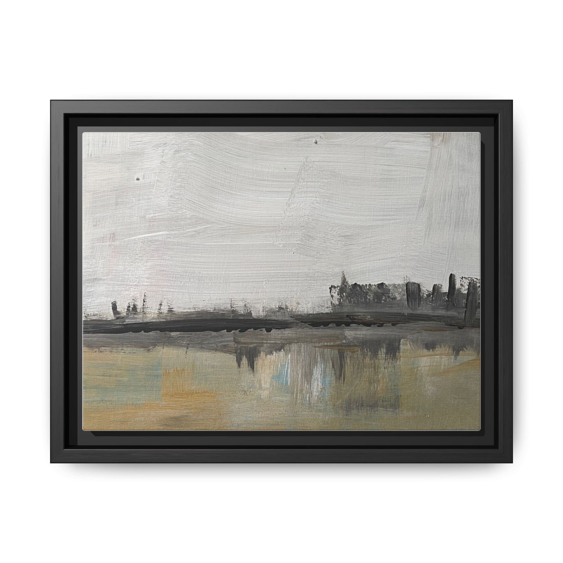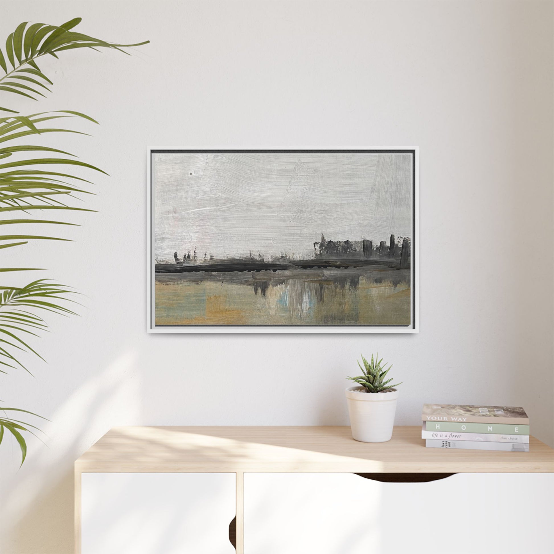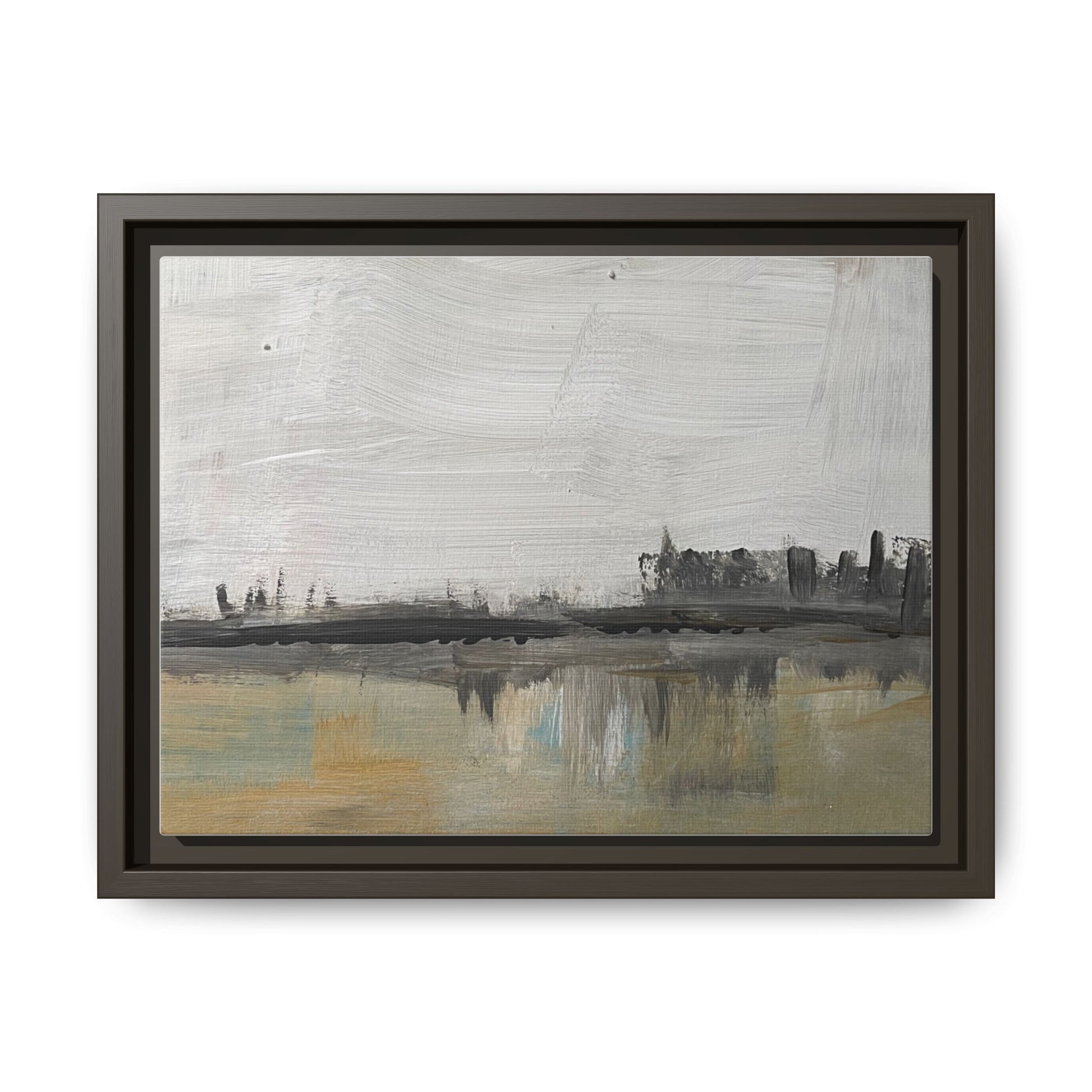 A calm, minimalist canvas print that captures a quiet urban moment — a simplified skyline mirrored in still water, rendered in muted, multi-color tones. The framed matte finish softens glare and emphasizes subtle contrast, letting the composition breathe on your wall. Hang it above a low bookshelf or in a hallway to bring a thoughtful, architectural pause to a busy space. It reads like a memory of citylight reflected; familiar to those who walk late streets and notice how glass and water become one. This piece complements modern, Scandinavian, and industrial interiors, and settles into apartment living, studio workspaces, or cozy reading nooks for evenings when you want a gentle, reflective atmosphere. This matte canvas capture—framed in warm pine—renders an urban landscape where muted ochres meet cool blue accents and soft grays. It feels like early morning coffee on a balcony, the city breathing slowly before the day begins.